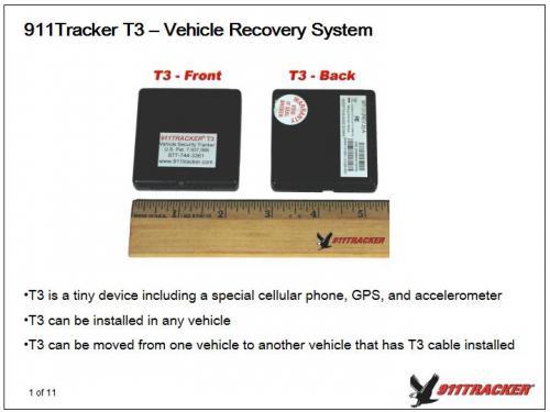 911Tracker, a technology leader in vehicle recovery systems, is launching the T3 Kickstarter Campaign. T3 is different because you are in charge. T3 follows the instructions that you text from your phone. T3 alerts you if your car has an emergency and T3 can connect a 3-way call to 911-Operator located close to your car. LoJackŪ and OnStarŪ can't do this. No other anti-theft system can do this.