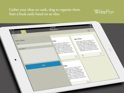 Writers know that outlining and planning a book is key to successful completion of a masterpiece. The flexible, clean WritePlan app makes life easier for aspiring and published authors during the process of planning, outlining and writing a book. More than a simple word processing document, the app was designed with the complex, recursive writing process in mind, helping authors organize ideas, chapters and subchapters as they go. As ideas evolve and writers wish to rearrange chapters and subchapters, the app allows writers to easily click and drag section "cards" to reorder them as desired.