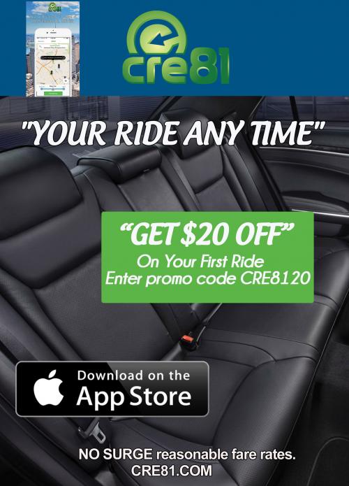 PHOTO CAPTION: Unlike Uber, CRE81 does not use surge pricing during peak driving times, but only charges published rates. Plus a 10% tip which goes 100% to driver.