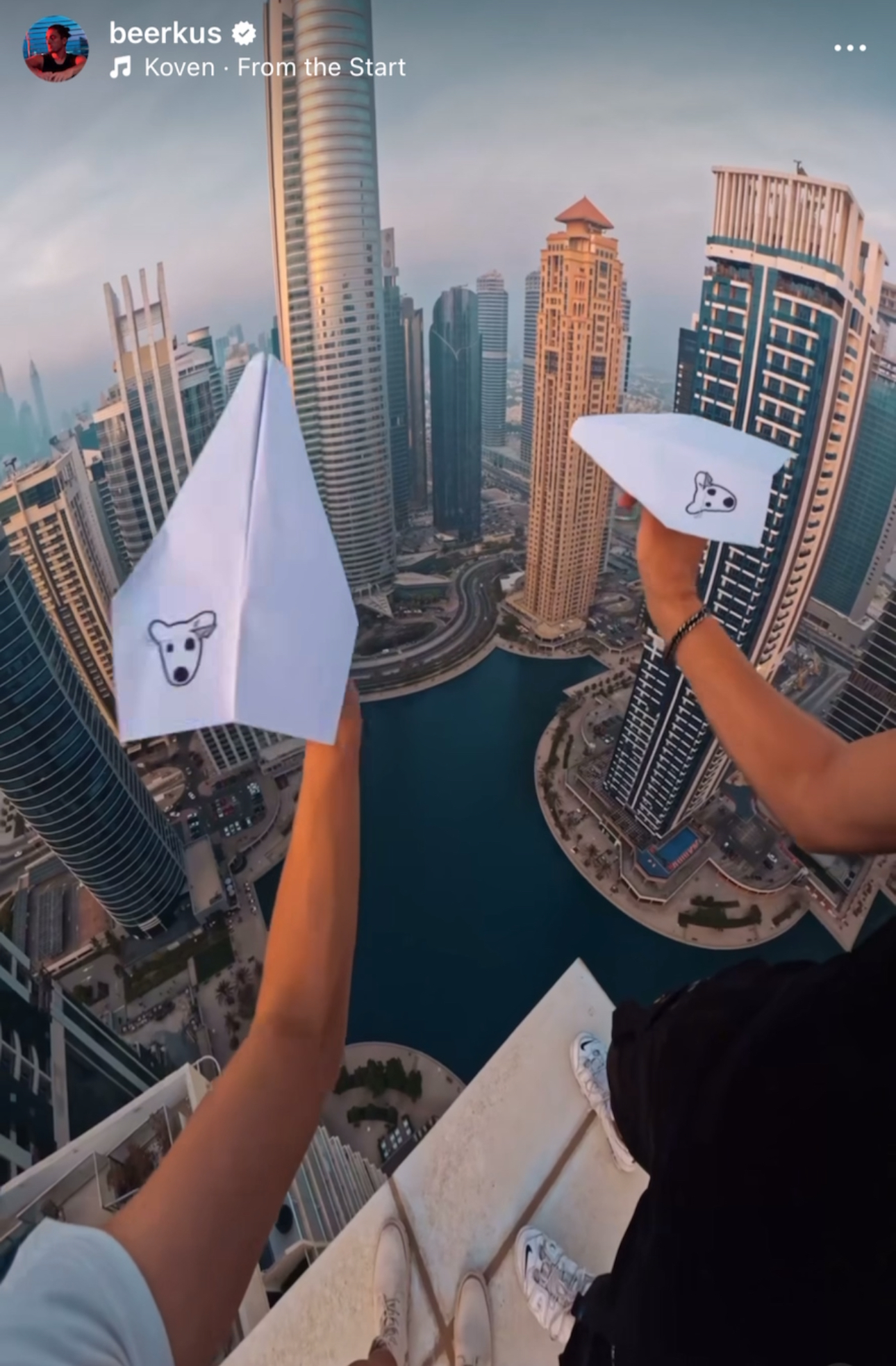 Stars of Netflix's "Skywalkers: A Love Story" performed daring stunts inspired by the $DOGS community's charitable spirit. They scaled China's Duge Bridge—the world's tallest bridge—to unfurl a $DOGS flag, and launched $DOGS-branded paper airplanes from a skyscraper. Their actions honor the community's dedication to charity and self-expression, encouraging others to embrace freedom and make a pos