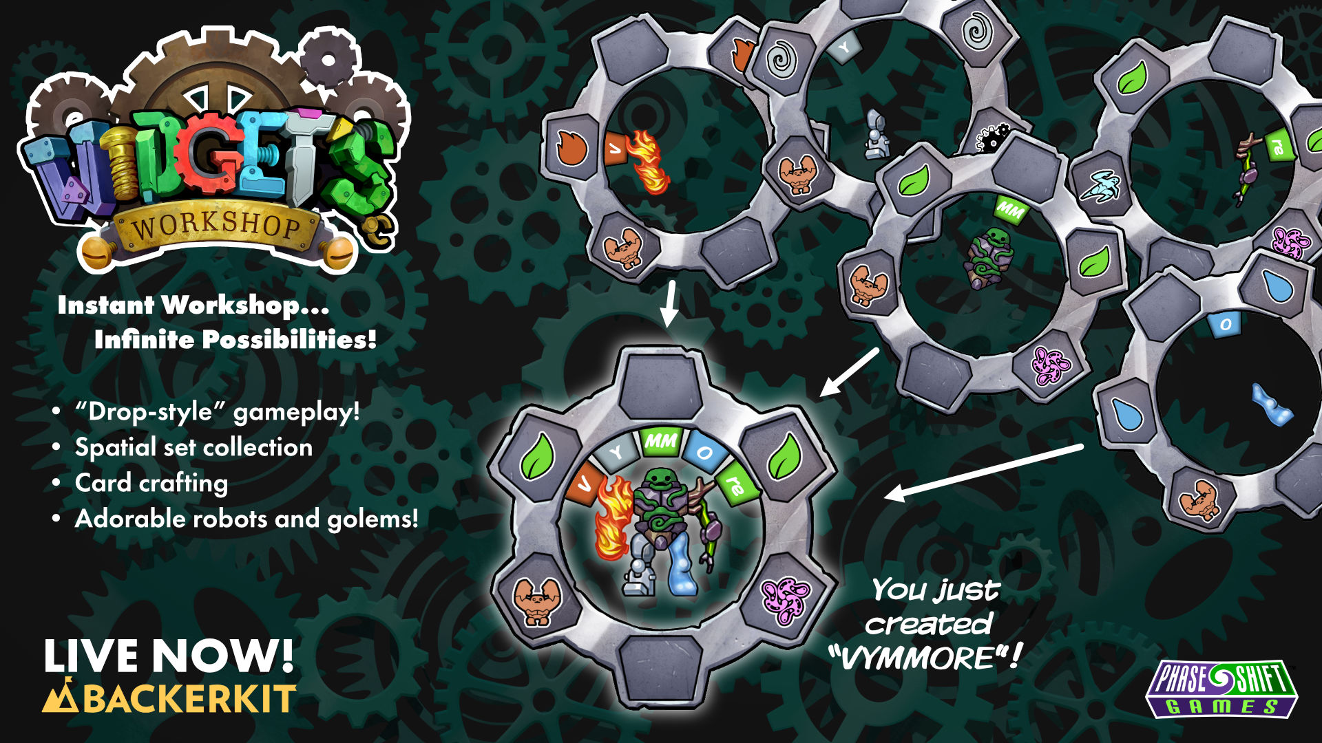 Announcing Widget's Workshop, a "drop-style," spatial set collection, card crafting tabletop game. Widget's Workshop is available for a limited time on BackerKit's crowdfunding platform, as part of their Pocketopia program, for $15 USD. The family-friendly and highly portable card game will ship to backers around October, 2025.